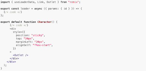 By this code, we have added a client-side filter to look at the specific character. You can also insert a Link component for every character, using the variable _id as an identifier. The Outlet component is what host the nested component.